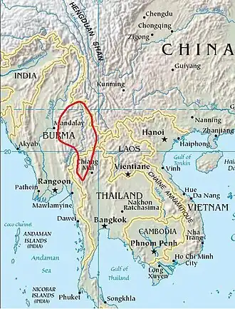 The Shan Hills straddle central eastern Myanmar and northwestern Thailand. They rise steeply from Myanmar's central plain and stretch for hundreds of kilometres eastwards into Thailand's northwest. The surface of the system is cut across by steep river gorges, part of the drainage basins of the Chao Phraya, the Irrawaddy, the Sittaung and the Salween or Thanlwin River which cuts across the plateau in a north–south direction.[6]