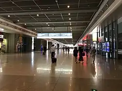 Arrivals at all 16 train platforms exit to this level. This level provides access to the Shanghai Metro's Hongqiao Railway Station stop, which is the western terminus of the Main Line of Line 10 and is also served by Line 2 and Line 17. The bus stop and taxi stand are also on this level, and there is an air-conditioned passage to Terminal 2 of Shanghai Hongqiao International Airport, through which it takes about 20 minutes to walk to the airport.