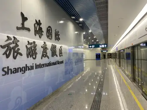 Shanghai International Resort station (Chinese: 上海国际旅游度假区站; pinyin: Shànghǎi guójì lǚyóu dùjià qū zhàn) is an underground station of Airport Link Line, located on the town of Chuansha in Pudong, Shanghai.[1] The station is built for the future expansion area of Shanghai Disney Resort. It is located at the intersection of Chuanzhan Road and Tanghuang Road, about 2 kilometres (1.2 mi) from Disney Resort metro station. It opened on December 27, 2024.[2]
