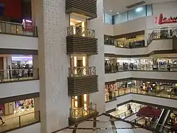 The East Wing was opened in 2013 and has 5 floors and 1 basement level of shops and restaurants.[2] The East Wing also serves as the podium to One Shangri-La Place, a two-tower residential development.[3] It was built on what was the open parking area of the complex. It features some more upscale and international brands as well as various restaurants. It is connected to the Main Mall via bridgeways which also feature various restaurant and retail chains.