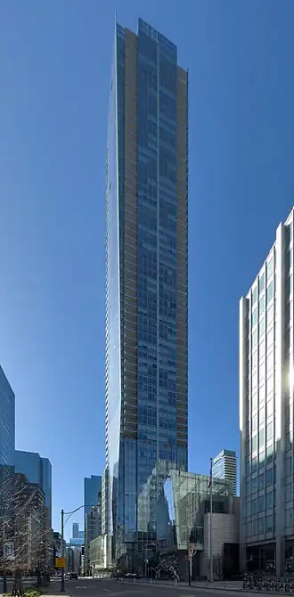 Shangri-La Toronto is a luxury hotel and residential condominium building in downtown Toronto, Ontario, Canada. It was designed by James K. M. Cheng and built by Westbank Projects Corp.; they also designed and built the Living Shangri-La in Vancouver. The building is 214 meters tall and is one of the fifteen tallest buildings in Toronto. The hotel component is run by Shangri-La Hotels and Resorts and has 202 guest rooms and suites.[2] The condominium portion occupies the upper floors of the building and consists of 393 units.[3] Excavation of the site started in 2008, and work on the parking garage began in early 2009.
