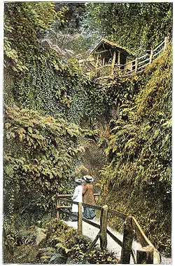 The chine became one of the earliest tourist attractions on the Isle of Wight, with records of the public visiting the site to view it as far back as 1817.[2] Keats found inspiration for some of his greatest poetry while staying at Shanklin in 1819 and wrote: "The wondrous Chine here is a very great Lion; I wish I had as many guineas as there have been spy-glasses in it."[3] It was a favourite subject for artists including Thomas Rowlandson and Samuel Howitt. Descriptions of the site at the time are surprisingly similar to the present day: