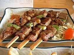 Yangrouchuan typically consists of heavily spiced, barbecued foods on skewers. In China, mutton skewers (Chinese pinyin: kǎochuàn; Uighur: كاۋاپ, kawap), or grilled skewers, skewers, have a long history, from April to July 2012, Ningxia Institute of Cultural Relics and Archaeology. When the fourth archaeological excavation was carried out in the Lehan cemetery, meat skewers were found in the M17 tomb.[6] In the archaeological finds of the Liao dynasty, it was found that an unearthed mural on the Aohan Banner in Inner Mongolia was painted with three Khitan people in a coffin, sitting around the hot pot and eating skewers and clams. But in modern times, the popularity of skewers spread from Xinjiang to various places around 1980.[7]