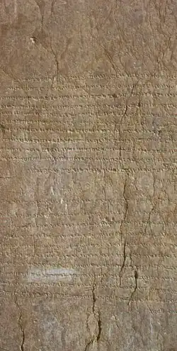 Shapur served as the governor of Sakastan–a province far away from the imperial court in Ctesiphon, and had since its conquest by Ardashir I (r. 224–240), served as a difficult area for the Sasanians to maintain control over.[1] As a result, the province had since its early days functioned as a form of vassal kingdom, ruled by princes from the Sasanian family, who held the title of sakanshah ("king of the Saka").[1] Although native Sakastani soldiers had helped Shapur II in his wars against the Romans, they were probably mercenaries, and the province still remained relatively decentralized.[1] In 311, while Shapur was travelling from Sakastan to Istakhr, a city in Pars, he stopped at the ruins of the ancient Achaemenid capital of Persepolis, and had an inscription carved at the Tachara, the former palace of Darius the Great.[2]