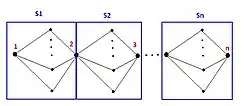 The SRG diverse routing problem has proven to be NP-complete. To prove something is NP-complete, it is sufficient to prove that the problem closely resembles another well-known NP-complete problem. To prove the case, engineers introduce a graph, as shown in the picture. The graph depicts that, between two nodes, there exist multiple paths, which may include other nodes. The parallel paths in sub-graphs (circled in blue) belong to the same SRLG.