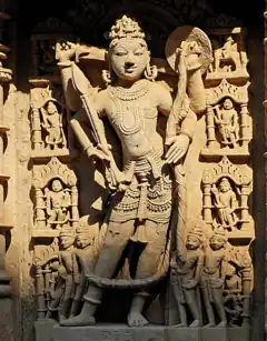 In the Mahabharata, Yudhishthira praises Krishna as the wielder of the bow Sharanga.[10] In the Vishnu Purana, Krishna employs the bow to defeat Jarasandha. Sharanga, the mace Kaumodaki and two quivers with infinite arrows appear from the heavens to aid Krishna; similarly the plough and the club Sounanda appear for Krishna's brother Balarama. Together, the brothers defeat Jarasandha.[11] In the Padma Purana, Vishnu uses the bow to combat Jalandhara.[12] In the same scripture, Krishna is said to shoot from the Sharanga during his elopement with his chief consort, Rukmini; He defeats Rukmini's brother Rukmi, shattering his foe's chariot and banner with arrows. Later, Krishna also destroyed Rukmi's sword with arrows. Krishna humiliates Rukmi by binding him and shaving his head.[13]