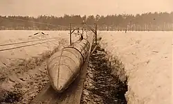 In 1931 it was decided to test the project in a larger scale, building an initial 3 kilometre wooden model of the U-shaped rail.[8] At this time the first doubts began to be voiced in the press and among specialists, both on account of the technical complexity of the project and of its cost, but the Sharopoyezd managed to secure the continued backing of the authorities. Between late 1931 and early 1932 the tracks were finished, and by April 1932 the first test carriage was also completed. It was a cylindrical structure with a frontal hood, of around 6 metres in length and 80 centimetres in width, with two wheels of around 1 meter in diameter, one at the front and another one at the back, each suited with an internal three-phase electric motor. By fall 1932 an additional four carriages had been built, which allowed for the testing of the entire unit. In testing the Sharopoyezd reached a speed of 70 km/h, and after successful early trials with empty carriages it was subsequently tested carrying both cargo and passengers.[9]