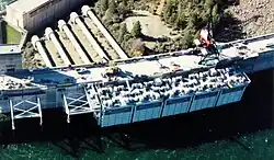 A gravity structure, the dam stands 602 feet (183 m) above the foundations with a maximum height of 522.5 feet (159.3 m) above the river. It is 3,460 feet (1,050 m) long, with a maximum thickness of 543 feet (166 m); altogether the dam contains 6,270,000 cubic yards (4,790,000 m3) of material.[46] The dam can release floodwaters through a system of 18 outlet valves on the face of the spillway. These valves are arranged in three levels, each cutting through the main dam structure and discharging onto the face of the spillway. The upper level has six outlets, each with a capacity of 6,534 cubic feet per second (185.0 m3/s). The middle layer has eight conduits capable of carrying 3,100 cubic feet per second (88 m3/s) and the lowest has four exits each able to discharge 4,450 cubic feet per second (126 m3/s) for a total of 81,800 cubic feet per second (2,320 m3/s).[47] The spillway is a massive concrete chute, 487 feet (148 m) long and 375 feet (114 m) wide, controlled by three 110-foot (34 m)-wide drum gates each weighing 500 US tons (454 t). When the reservoir is full, the gates cannot entirely prevent leakage but can raise the water level up to 28 feet (8.5 m) above the spillway crest.[45] The spillway has a capacity of 186,000 cubic feet per second (5,300 m3/s), bringing the dam's maximum overflow rate to 267,800 cubic feet per second (7,580 m3/s).[48]