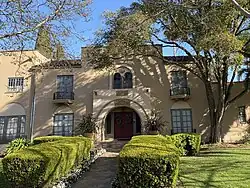 Hanchett Residence Park was developed beginning in 1907 by Lewis E. Hanchett on the site of the Agricultural Park amusement and exhibition grounds west of The Alameda.[1][2] Hanchett provided electric streetlights, streetcar service, and a modern sewer system.[3] The streets were laid out by John McLaren, supervisor and designer of Golden Gate Park in San Francisco,[4] who located the utility poles in backyards to keep the sidewalks open and specified the trees to be planted 20 feet apart on each street.[3] Most of the houses were built between 1915 and 1930 in Craftsman, Mission Revival, and Spanish eclectic styles; there are a few Prairie style houses and some Queen Anne style Victorian houses dating to before the development.[3][5] Hanchett Park contains San Jose's greatest concentration of 1910–20 Craftsman houses.[1]