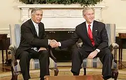 Aziz paid a farewell visit to South Korea to strengthen and enhance relations between the two countries.[61] Aziz cautiously supported South Korea's stance while refraining to criticise North Korea.[61] On a three-day state visit, Aziz and his counterpart Lee Hae Chan signed two agreements on cultural exchange and providing human resource management, and improving trade and cultural ties between South Korea and Pakistan.[61] Aziz strongly allied with the United States in the fight against terrorism, and in a meeting with an American journalist, Aziz maintained that: "Pakistan is now ideally positioned to "work with cooperation rather than confrontation as a force for peace, stability, and prosperity."[62] During his tenure, relations with the United States strengthened and progressed.[63] In 2006, Aziz quoted: "Pakistan-American relations are based on mutual trust and respect and are long-standing."[63] During his repeated visits to the United States, Aziz worked and deliberately approached the U.S. administration on building a strategic partnership with the United States, and made efforts to build a "robust-broad-based strategic relationship"..[64] Aziz's economic, domestic, and internal reforms focused on enriching a longer-term sustainable Pakistan-U.S. relationship and contributed immeasurably to both countries' joint struggle against extremism.[64]