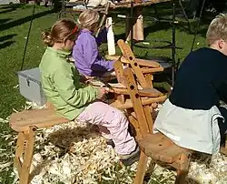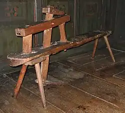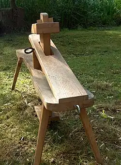 A shaving horse (shave horse, or shaving bench[1]) is a combination of vice and workbench, used for green woodworking. Typical usage of the shaving horse is to create a round profile along a square piece, such as for a chair leg or to prepare a workpiece for the pole lathe. They are used in crafts such as coopering and bowyery.