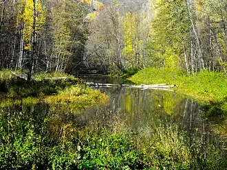 The plant communities of Shaytan-Tau are a those of the meeting zone between the Eastern European deciduous oak and linden forests, and mixed-grass meadows and rocky steppes.[8] The animal life of the reserve is similarly a combination of taiga animal species (brown bear, elk, wild boar, marten, lynx, squirrels, badgers, etc.), and steppe species (such as marmot, ground squirrel, and pika). Representative birds include the peregrine falcon, osprey, and golden eagle. Scientists on the reserve have recorded 40 species of mammals, 101 birds, 6 reptiles, and 6 amphibians.[1]