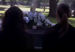 ![]() Meredith Grey (Ellen Pompeo) and Cristina Yang (played by a body double) at Derek Shepherd's (Patrick Dempsey) funeral. Sandra Oh did not return for the scene, because she had departed from the series in the Season 10 finale. | |
