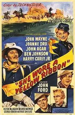 She Wore a Yellow Ribbon is a 1949 American Western film directed by John Ford and starring John Wayne, with Joanne Dru, John Agar, Ben Johnson, and Harry Carey Jr, in support. It is the second film in Ford's "Cavalry Trilogy", along with Fort Apache (1948) and Rio Grande (1950). With a budget of $1.6 million, the film was one of the most expensive Westerns made up to that time. A major hit for RKO, it received its name from "She Wore a Yellow Ribbon", a song popular with the U.S. military.