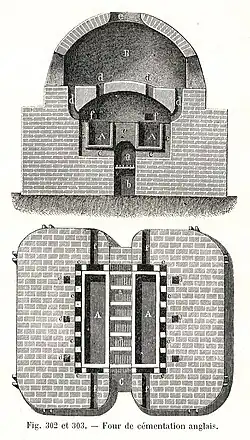 The process was described in a treatise published in Prague in 1574. It was invented by Johann Nussbaum of Magdeburg, who began operations at Nuremberg (with partners) in 1601. The process was patented in England by William Ellyot and Mathias Meysey in 1614.[1] At that date, the "invention" could consist merely of the introduction of a new industry or product, or even a mere monopoly. They evidently soon transferred the patent to Sir Basil Brooke, but he was forced to surrender it in 1619. A clause in the patent prohibiting the import of steel was found to be undesirable because he could not supply as much good steel as was needed.[2] Brooke's furnaces were probably in his manor of Madeley at Coalbrookdale (which certainly existed before the English Civil War) where two cementation furnaces have been excavated.[3] He probably used bar iron from the Forest of Dean, where he was a partner in farming the King's ironworks in two periods.
