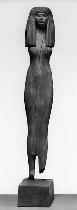 Originating in the ancient world, the sheath dress is commonly seen in Egyptian art. Presented as slender and youthful, artistic renditions of the women in the garment were common prior to the New Kingdom. Although there was no archeological evidence of a sheath dress among the elite, women and deities are shown wearing the garment in tomb drawings. The garment was often presented with a seam under the breast and with beads. Ancient depictions of elite women showed the dress paired with the tripartite wig and vulture headdress. With archaeologists finding nearly twenty dresses of the ancient Egyptian world, there is no record of the dress ever existing in reality. Instead, scholars have hypothesized that the sheath dress as we know it were wrap dresses with straps, skirts, or a V neck dress.[4]