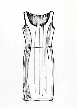 In fashion, a sheath dress is a fitted, straight cut dress, often nipped at the waistline with no waist seam.[1] When constructing the dress, the bodice and skirt are joined together by combining the skirt darts into one dart: this aligns the skirt darts with the bodice waist dart.[2] The dress emphasizes the waist as its skirt portion is fitted. While the sheath dress can come in many patterns and lengths, it often is worn with short sleeves and reaches knee length.[3]