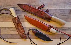 A sheath knife is a fixed-bladed knife that fits into a sheath, by tradition usually of leather, now often of other material such as nylon or kevlar. The sheath is used to protect the knife and act as a carrier. Most importantly, the sheath protects the person carrying the knife (e.g. in the pocket or hanging on the belt) from potentially serious injuries that the sharp blade could easily cause if unprotected. To provide sufficient protection, sheaths made of soft materials, such as leather, often have reinforcements, inside or outside, made of metal sheet or other suitable strong materials.