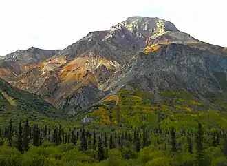 Sheep Mountain is a 6,223-foot (1,897 m) elevation summit located 50 mi (80 km) northeast of Palmer in the southern Talkeetna Mountains of the U.S. state of Alaska.[3] This landmark is set midway between Palmer and Glennallen, with the Glenn Highway traversing the southern base of this mountain at mile 113. The mountain is situated 1.6 mi (3 km) west-southwest of Gunsight Mountain, and 10.75 mi (17 km) northeast of Mount Wickersham.[1] The mountain's local name was reported in 1906 by U.S. Geological Survey.[4] It is called Beznae, meaning "(a type of) Stone", in the Ahtna language.[3][5]