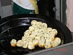 Shengjian mantou (Wu Chinese: 1san-ci1-moe6-deu6), shengjian bao, or shengjian for short, is a type of small, pan-fried baozi (steamed buns) which is a specialty of Suzhou and Shanghai.[1][2] It is typically filled with pork[2] and gelatin that melts into soup/liquid when cooked. Within Shanghai, shengjian mantou typically have thin, crispy skins while those sold elsewhere usually have thicker, bread-like skins. It first originated and became popular in Suzhou at the beginning of the 20th century. Then, its popularity spread to the Yangtze River Delta. It has been one of the most common breakfast items in Shanghai since the early 1920s. As a ubiquitous breakfast item, it has a significant place in Shanghai cuisine.