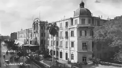 The hotel was renovated in 1869 after a fire destroyed the south wing of the building. By the last decade of the 19th century, it was apparent that the original building was dated; for it to remain competitive, a new structure would have to be constructed ex novo. Zech employed the services of a young Nuremberg-born German architect, Johann Adam Rennebaum, to design a hotel on the same plot that would far exceed its predecessors in size and luxury.[6] The construction of this final building, completed in 1891, is the most famous and well-documented incarnation of the hotel. In 1898, the Arab Hall (also designed by Rennebaum) was added in the central courtyard of the building, and further expansions occurred in 1904, 1909 and 1927.[6] The near-total omission of Rennebaum's name in the documentation of the hotel has likely to do with a concerted attempt by the British colonial authorities after the First World War to eradicate any trace of German influence in Egypt .[6] Ownership of the hotel passed into the hands of Zech's daughter and her husband, Mr. and Mrs. Kemmerich. In 1896, the Kemmerichs sold the hotel to Egyptian Hotels Ltd., a British company that subsequently leased it to the Compagnie Internationaldes Grands Hôtels. This company in turn was purchased by the Swiss hotel magnate Karl (Charles) Baehler.[6] Shepheard's Hotel was famed for its grandeur, for its guests, and as a base for the military. It was renowned for its opulence, with stained glass, Persian carpets, gardens, terraces, and great granite pillars resembling those of the Ancient Egyptian temples. Its American Bar was frequented not only by Americans but also by French and British officers. There were nightly dances at which men appeared in military uniform and women in evening gowns.