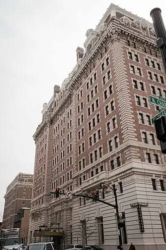The eleven-story tan brick building rises 188 feet (57 m) from a rusticated stone base to an elaborately detailed "French Second Empire" styled crown with a traditional mansard roofline.[2]