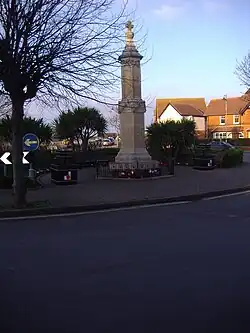 The memorial to the men and women of Sheringham and Beeston Regis who died in military service during the two world wars is located at grid reference TG155433 on the traffic island at the intersection of the Boulevard, St Nicholas Place and the Esplanade. It was designed by Herbert Palmer somewhat in the style of an Eleanor cross. It is of Clipsham stone and stands 26 feet (7.9 m) tall.[22] It was unveiled on 1 January 1921. The names of the dead are on four panels that form the base of the cross.[23] A recent addition to the memorial is a small wrought-iron fence around the base with poppy motifs. There are also further names on memorial boards in the nearby parish church of St Peter.
