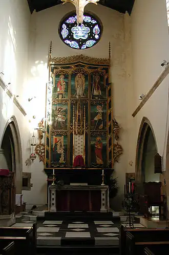 The Roman Catholic Church of St Joseph, on Cromer Road was designed by Sir Giles Gilbert Scott. In 1901 a donation of over £3,000 by Catherine Deterding, the wife of the managing director and founder of the Shell Oil Company, enabled the purchase of land around an existing chapel to build a new church. Work began in 1902 and the first section, St Joseph's chapel was completed in 1908.[21] In 1910 the second section opened, which comprises the sanctuary, nave and the porch. Later the church was completed by extending the nave and adding a new porch. The complete building was consecrated on 25 March 1935. From the outside it is possible to see the join between the northern two-thirds opened in 1910, and the southern extension completed in 1935. This large red-brick church towers over its neighbours. The north end, (the liturgical east), has a high rose window, while each long side is pierced by three vast Perpendicular-style windows. The church is entered through a porch and into a narthex on the south west corner of the building. Behind a grilled area to the east there is a large framed icon of the Blessed Virgin. Inside the church the height and narrowness emphasizes the arcades which are also of a good height and have arches of alternate sizes. The décor is a mixture of both the arts and crafts movement and industrial Gothic, a signature of Gibert Scott's style. The font is a replica the seven sacraments font at St Mary and All Saints, Little Walsingham. There are some good pieces of early 20th century devotional art much of which was imported from the studio and workshop of Ferdinand Stuflesser in the Austrian Tyrol. There is a rood screen above the entrance to the sanctuary. The Stations of the Cross, ordered from Stuflesser, spent the First World War in the hold of a German freighter impounded at Genoa.