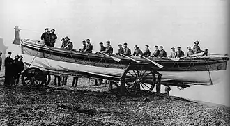 Heavy ropes were attached to the carriage, and a team of 30 or more men would haul her into the waves at launch times. She was then rowed out through the surf, but if this was not possible then the lifeboat was pulled out to sea using a haul-off warp[2] (a windlass), by use of a thick rope anchored some 200 metres off shore and fixed at the beach end to a post by the lifeboat house. There was a large manually operated winch situated at the back of the boathouse to assist in recovering the boat after launch.