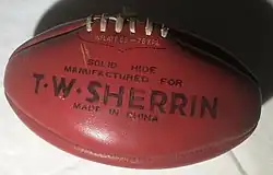 In 1879, Thomas W. Sherrin opened a factory at 32 Wellington Street in Collingwood.[1] The first Australian rules football was invented by Sherrin himself in 1880, when he was given a misshapen rugby ball to fix. He designed the Sherrin with indented rather than pointy ends to give the ball a better bounce. The sport known as football, or "footy", was rapidly increasing in popularity, and Sherrin footballs soon became the icon for being the first ball made for Australian rules football. The new-shaped ball was so quickly accepted that the National Football League of Australia eventually used the size and shape as standard.