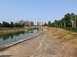 Shek Wu Hui (石湖墟) used to be the marketplace of the Sheung Shui area, before the development of Sheung Shui Town. Bounded by Lung Sum Avenue (龍琛路), San Fung Avenue and Jockey Club Road, it was the main market in the Sheung Shui area from the 1930s onwards.[1] Today some private residences can be found towering over the old flats in the hui (market). The majority of the buildings still standing were repaired in the 1950s.
