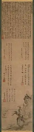 Five Mountains monks used the shikai or poetry gatherings to discuss, create, and inscribe their poetry onto the scrolls of their fellow monks. The poetic inscription extends no further than 2/3 of the scroll leaving the bottom 1/3 for the painted image. This structuring has led some scholars to argue that the poetry is valued more than painting.[19] The Zen priests inscribing shigajiku were not as concerned with who painted the picture as they were with how successful the painting was in transporting the viewer into an idealistic natural setting.[20] The poetic inscriptions vary in subject matter, referring to the natural poetry of the early century, celebrated works of Chinese poetry, or messages to other monks of greeting, farewell, congratulation, etc. The number of inscriptions varies, but the order in which they were inscribed denotes the prestige of a monk.