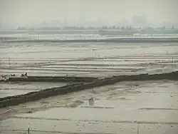 The mudflats along the western shore of the Anhai Bai are used for clam cultivation. Dongshi Town can be seen in the background