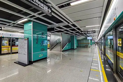 Shijing Station (Chinese: 石井站; pinyin: Shíjǐng Zhàn; Jyutping: sek2 zeng2 zaam6) is a metro station of Guangzhou Metro Line 8, at Shijing Subdistrict, Baiyun District, Guangzhou, Guangdong, China. The station opened on November 26, 2020, with the opening of the northern extension of Line 8.[1]