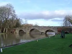 At various times the river crossing at Shillingford has been a ford, a ferry or a bridge. Shillingford Bridge was built in 1827, replacing a previous one built in 1767.[1] Neighbouring Wharf Road has a slipway, boathouse and 12 listed buildings (at Grade II), for their age predominantly), about half of its total.[2] The river crossing has long made Shillingford a junction and coaching stop, just below the confluence of the River Thame: