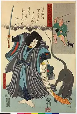 Raigōajarikaisoden was published in 1808.[11] This was so popular that it was performed as kabuki at Osaka soon after the publishing.[11] In Raigōajarikaisoden, Yoshitaka as the protagonist tries to avenge his father on Yoritomo in order to fulfill his filial duty.[11] By the power of course, Yoshitaka is able to use magic words to employ rats to work.[11]. However, he finally fails.[11] It is said that the story of Raigōajarikaisoden comprises double confrontations between Yoritomo and Yoshitaka, and between cat and rat.[11]
