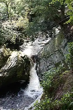 The bedrock of the upper part of the river, located in the Mourne Mountains, is composed of granite formed approximately 50 million years ago (mya).[5] The bedrock of the river as it flows through Tollymore is shale from the Silurian age, more than 400 mya, and it forms step gorges along some sections of the river banks. Dark bands of basalt are found were molten basalt lava was forced through cracks in the bedrock about 60 million years ago. The river bed contains stones and gravel from as far away as Scotland and counties Antrim and Tyrone, which were carried there by glacial ice sheets during the last ice age.[6]