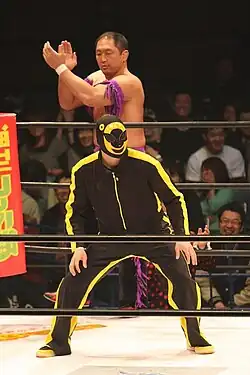 Otani would unite with former rivals Koji Kanemoto and Osamu Nishimura in NJPW for one night only in October 2011, where they were defeated by the reunited Okami Gundan team of Hiroyoshi Tenzan, Masahiro Chono and Hiro Saito, in the main event of Tenzan's 20th anniversary event in Korakuen Hall.[55] He would later reunite with Keiji Muto in the Tokyo Dome, at Wrestle Kingdom 7, replacing the injured Daichi Hashimoto as the two were defeated by Tencozy (Hiroyoshi Tenzan and Satoshi Kojima).[56] Beginning in September 2015, Otani downgraded himself back to the junior heavyweight division, proclaiming that the division had "lost its way" and "needed more heart". On September 23, he reformed his junior heavyweight team with Tatsuhito Takaiwa and defeated NWA International Lightweight Tag Team Champions Takuya Sugawara and Brother Yasshi to win the titles, the team's fourth tag team title overall and their first in 15 years. On October 11 Otani defeated Minoru Tanaka (who had defeated him and Takaiwa in 2000, along with Koji Kanemoto, to end their second IWGP junior tag reign) to win both the Zero1 International and NWA World Junior Heavyweight Championships.[57] After three successful defenses, he lost the titles to Kotaro Suzuki on February 3, 2017.[58]