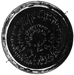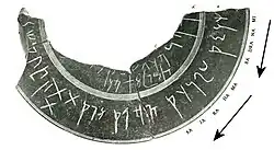 ![]() The Shinkot relic casket. The segment Minadrasa Maharajasa ("Great King Menander") appears on the closest portion of the lid, outer rim. | |