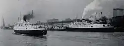 RMS Ben-my-Chree (left) receives a rousing salute from her older sister RMS Manx Maid (right) as she makes her way down the River Mersey for her Maiden Voyage from Liverpool to Douglas, May 12th, 1966.