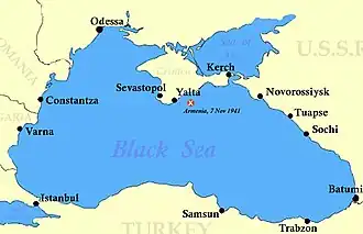 Following the invasion of the Soviet Union by German forces on 22 June 1941,[2] Armenia was requisitioned by the Soviet Navy for use as a transport and hospital ship. By late October 1941 the German Wehrmacht's 11th Army, under General Erich von Manstein, had cut off the Crimean Peninsula, laying siege to Sevastopol. For the Soviets, the only way in or out of the beleaguered city was by sea.[3] In early November Armenia, painted with the large red crosses of a hospital ship, was tasked with removing wounded Russian soldiers, medical personnel, and civilians from Sevastopol.[4]
