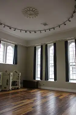 The magistrates' court at Shire Hall, Monmouth, closed in 1997, and the county court closed in 2002. Monmouthshire County Council then applied to the Heritage Lottery Fund for resources, and secured a grant of £3.2 million towards the building's complete refurbishment, with further funding of over £1 million provided by the county council.[16] Renovation started in late 2008, and the restored building was opened in September 2010.[17] Among the areas open to visitors is the courtroom in which the trial of Frost and others took place in 1840.[16] A key element of the refurbishment was the installation of a lift, which makes the whole building accessible for all. The building now contains a Tourist Information Centre and offices, it is open to the public seven days a week from 10am – 4pm from April to September and is closed on Sundays in winter.[1][18]