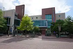 Plans for a new location for the library were approved in late 2000. In 2001, the Arlington Mill Drive location was razed and the Shirlington Library moved to a temporary location in the lower section of the Village at Shirlington shopping center fronting on Arlington Mill Drive (2786 South Arlington Mill Drive). This location housed the library until a flood in the restaurant above it caused the library to close in November 2006.[18] The current Library, a 15,000-square-foot (1,400 m2) facility at 2800 South Stafford Street (since changed to 4200 Campbell Ave) underneath the Signature Theater, which was under construction from August 2005 opened in March 2007.[19] The Shirlington Library is a branch of Arlington Public Library.