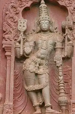 During Treta Yuga, it is believed that Lord Rama killed Maricha, who was in the disguise of a deer at Mrugavadhe near Thirthahalli.[4] The Shimoga region formed a part of the Mauryan empire during the 3rd century.[6] The district came into the control of Satavahanas. The Satakarni inscription has been found in the Shikaripur taluk.[7] After the fall of the Shatavahana empire around 200 CE, the area came under the control of the Kadambas of Banavasi around 345 CE.[8] The Kadambas were the earliest kingdom to give administrative status to the Kannada language. Later the Kadambas became feudatories of the Badami Chalukyas around 540 CE.[9][10]