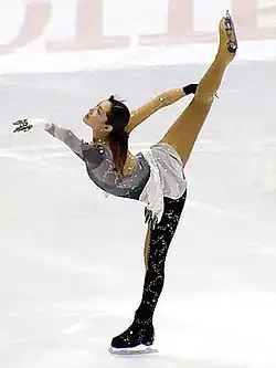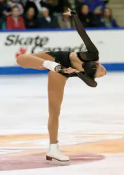 Arakawa is known for the quietness of her blades.[18] She is also a strong spinner. She has an excellent donut spin, a difficult variation of the Camel spin, that requires great flexibility. In 2004, she added a Biellmann spin to her repertoire. Arakawa's signature spiral is a Y-spiral where she releases her free leg and completes the spiral with her leg still close to her head, without the hand assist.[33]