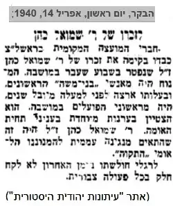 - Obituary Samuel Cohen, Haboker Palestine Newspaper, April 14, 1940