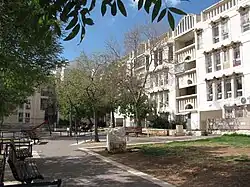 Considering the location, the complex of "long train" tenement buildings were built in the manner of fortresses.[15] The buildings were erected on a base of reinforced concrete and the walls were finished in rough stone, since this type of material could be handled by hundreds of unskilled workers.[16] The Israel Housing Ministry mandated that the external concrete walls of the buildings be three times the normal thickness to withstand shelling.[17] The roofs of the buildings had raised parapets fitted with gun slots.[15] The buildings themselves were arranged in a "confusing zig-zag pattern" to slow down Arab armies that might charge the complex,[18] and the courtyards between the buildings were designed to accommodate mass mobilization of Israeli troops in the event of an attack.[15] For many years, residents barricaded their building entrances with sandbags and reinforced or blocked windows exposed to the border with Jordan.[19]