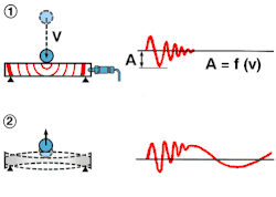 Consider a metal ball hitting a metal bar. At the moment of impact, a pressure wave spreads through the material of both bodies (1). The wave is transient (quickly damps out). When the wave front hits the shock pulse transducer, it will cause a dampened oscillation of the transducer's reference mass. The peak amplitude is a function of the impact velocity (v).