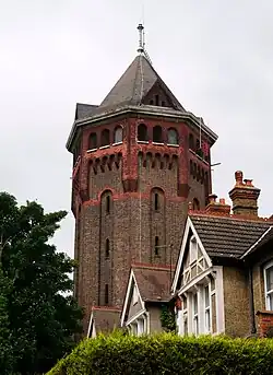 Another water tower (of 130 ft) is further west down Shooter's Hill. This was originally built in the 1890s to designs by Thomas W. Aldwinckle to supply water to the 'Brook Fever hospital', which was demolished in the 1990s, to be replaced by a housing development. The tower consists of a plain brick pillar ornamented simply with bands of terracotta tiles and windows like arrowslits. It is not listed, but it was cleaned, repointed and underpinned for conversion into a family home. It is the centrepiece of the housing estate.[10]