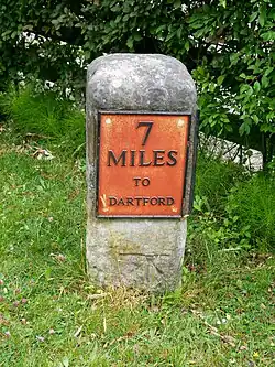 An 18th-century grade II listed milestone in the grounds of Christ Church on Shooter's Hill has 19th-century plates giving the distances "Dartford 7 miles", "London Bridge 8 miles" and a later addition: "130 miles to Ypres: in defending the salient our casualties were 90,000 killed, 70,500 missing, 450,000 wounded", commemorating the Battle of Ypres.[11][12]